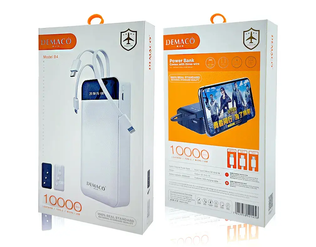 מטען נייד דגם B4 מבית Demaco קיבולת 10,000mAh עם 3 כבלים מובנים
