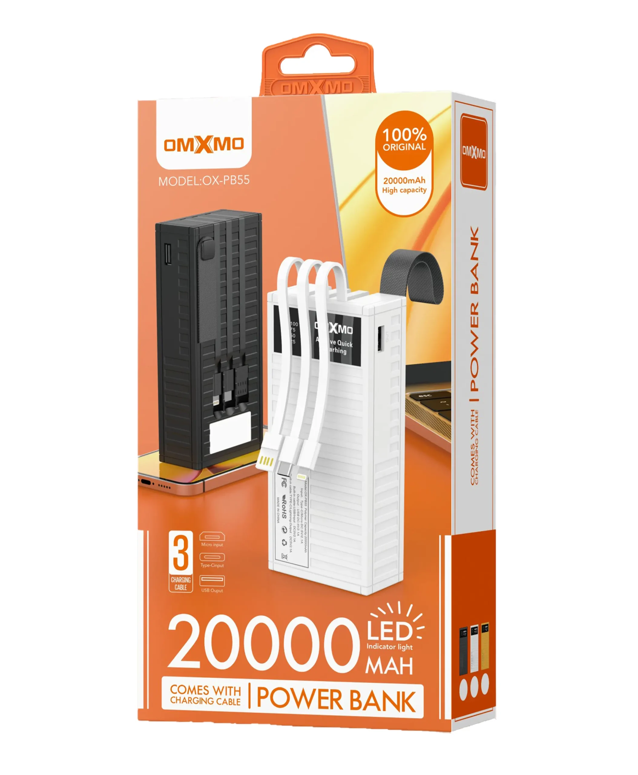 מטען נייד דגם PB55 קיבולת 20,000mAh עם 3 כבלים