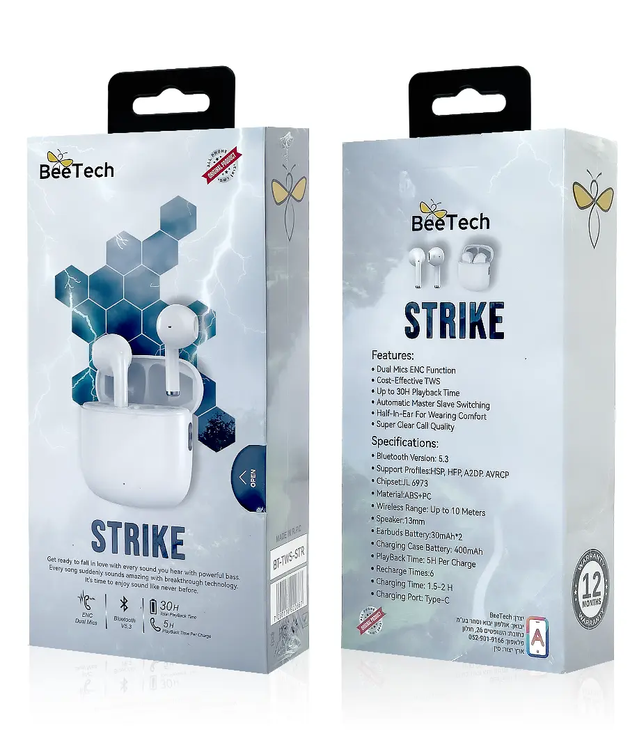 באנדל 6 אוזניות TWS דגם Strike מבית BeeTech עם פונקציית ENC לביטול רעשי רקע
