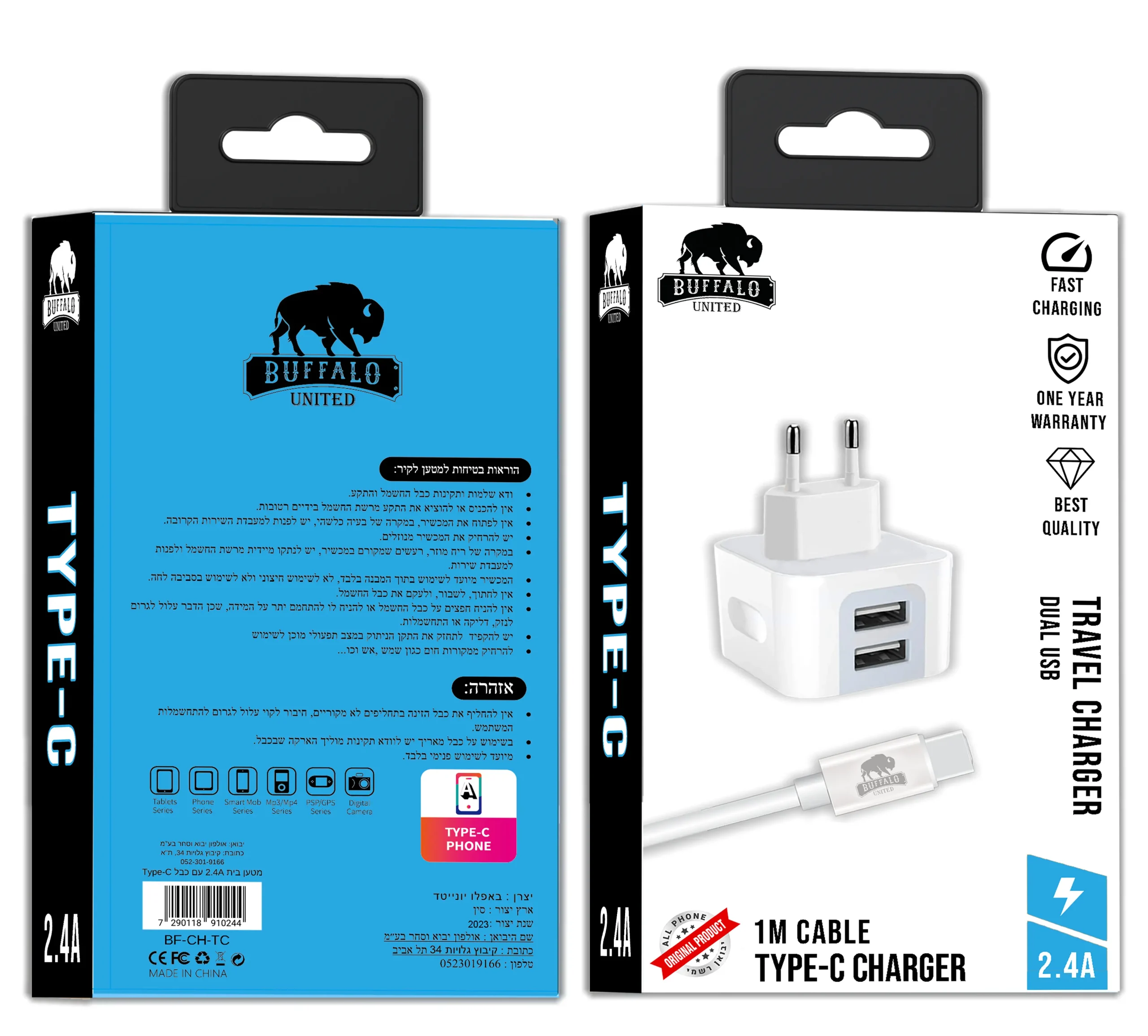 מטען 2.4A עם כבל USB Type-C מבית באפאלו