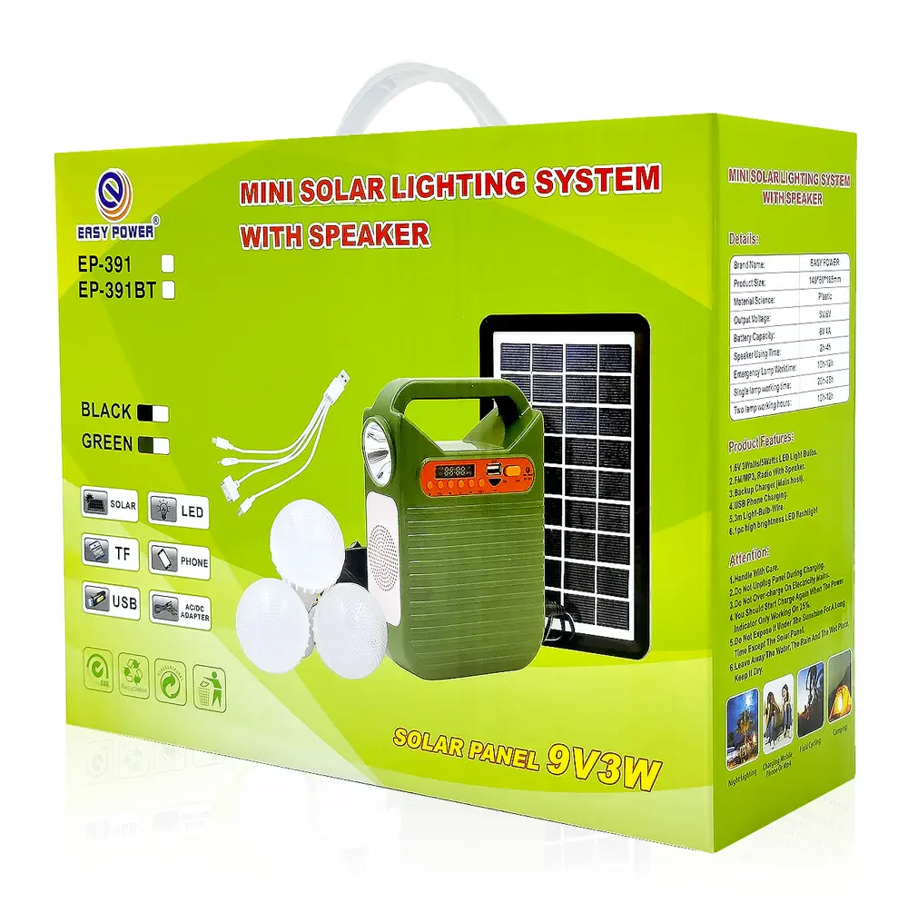 סוללת גיבוי עם מערכת תאורה ניידת ורדיו דגם EP-393BT עם טעינה סולארית, טעינה חשמלית, רדיו ומטען נייד חיבור USB 5V